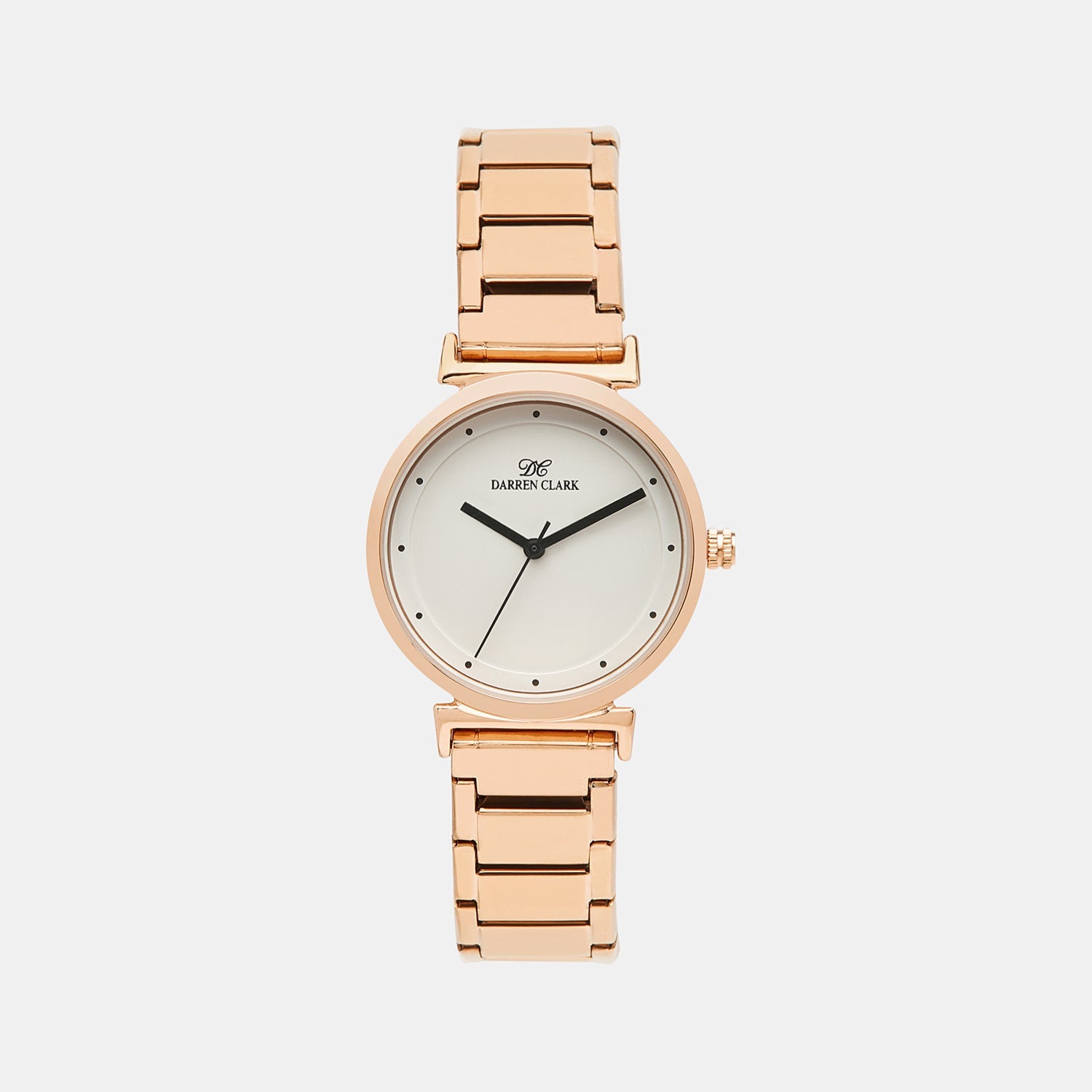 Elevate your formal wear with the Darren Clark round Stainless Steel watch. Featuring a sleek white analog display, Japanese 3 ATM movement, and rose gold metal strap, this women's watch has a 16 mm strap width and 8 mm case thickness for a comfortable fit. With 3 hands, a 1-year warranty, and a 32 mm dial diameter, this watch is perfect for any occasion. Made in India.